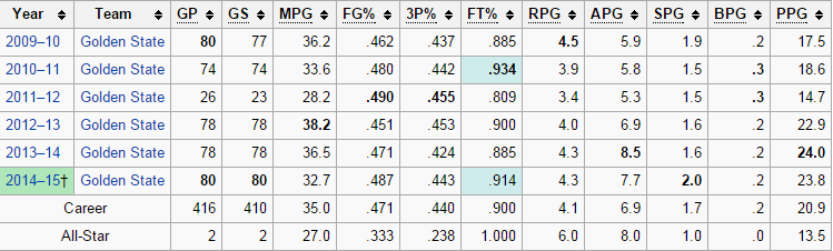 De statistieken van stephen Curry van zijn carriere tot het seizoen 2014-2015